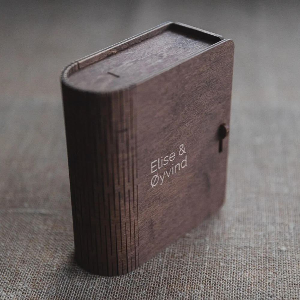 En unik og håndlaget USB-boks med en personlig, lys gravering på lokket. Den ser ut som en liten bok, og lukkes med et lite trehåndtak. Bokryggen av boksen er fleksibelt og slitesterkt. Boksen er fylt med ekte mose og kongler.